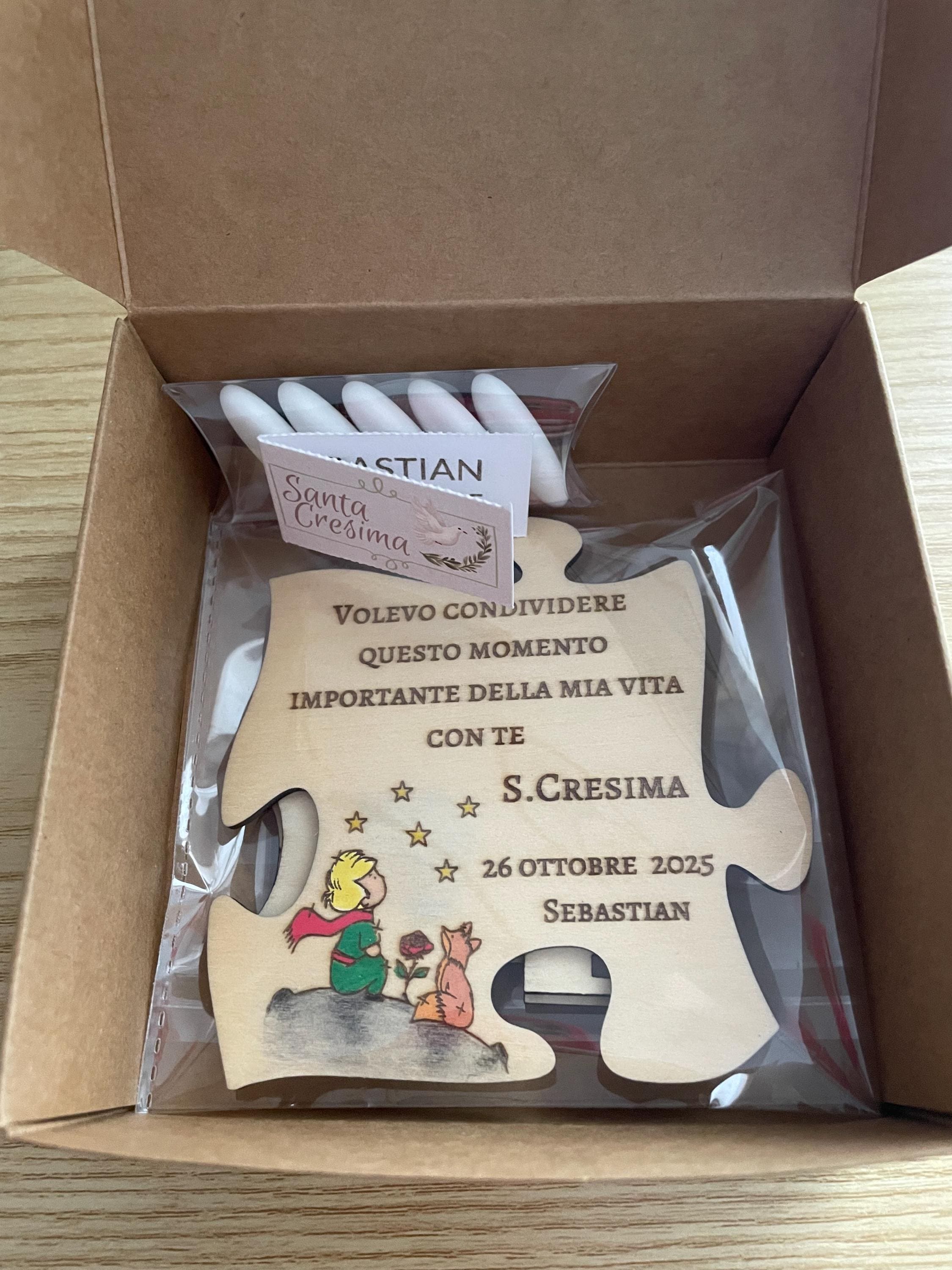 Under a starry sky, your Confirmation becomes a keepsake to display: a mini 10x10 cm wooden picture laser-engraved with a scene inspired by The Little Prince, personalized with your name, date, and a short dedication.