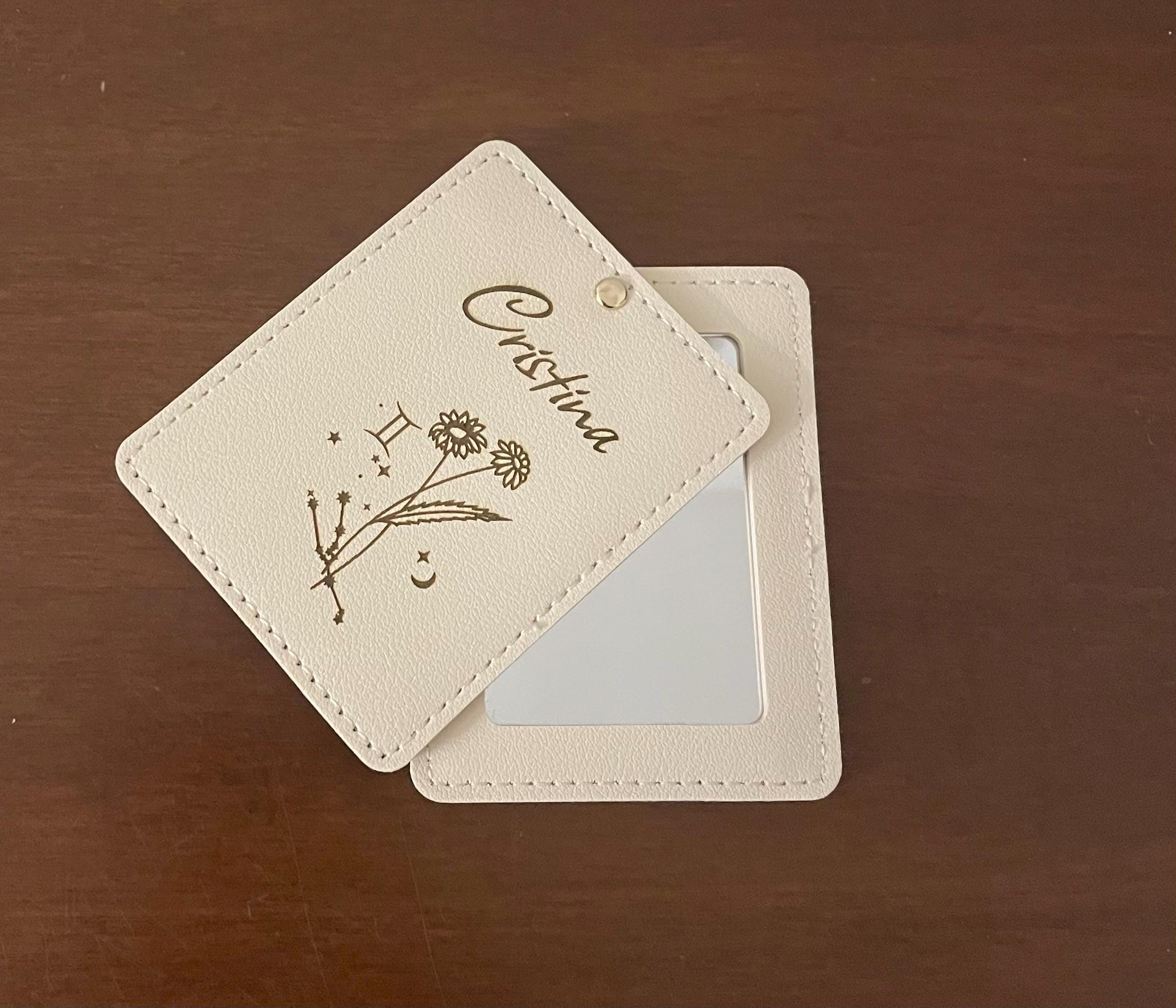 Pocket-sized, unique, yours.Faux leather purse mirror with laser-engraved name and zodiac sign + sliding closure.Lightweight, elegant, and also perfect as a Christmas gift. ✨