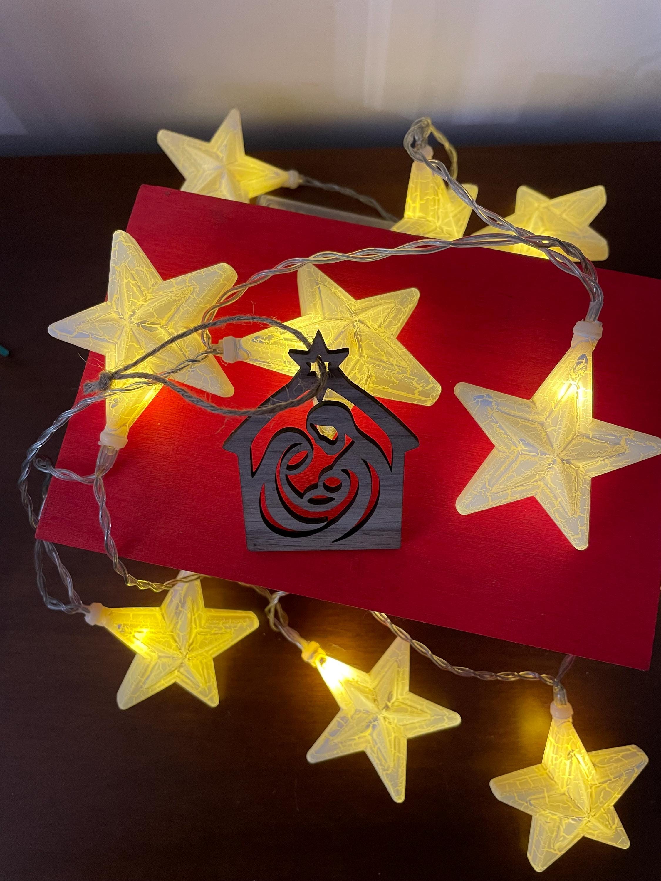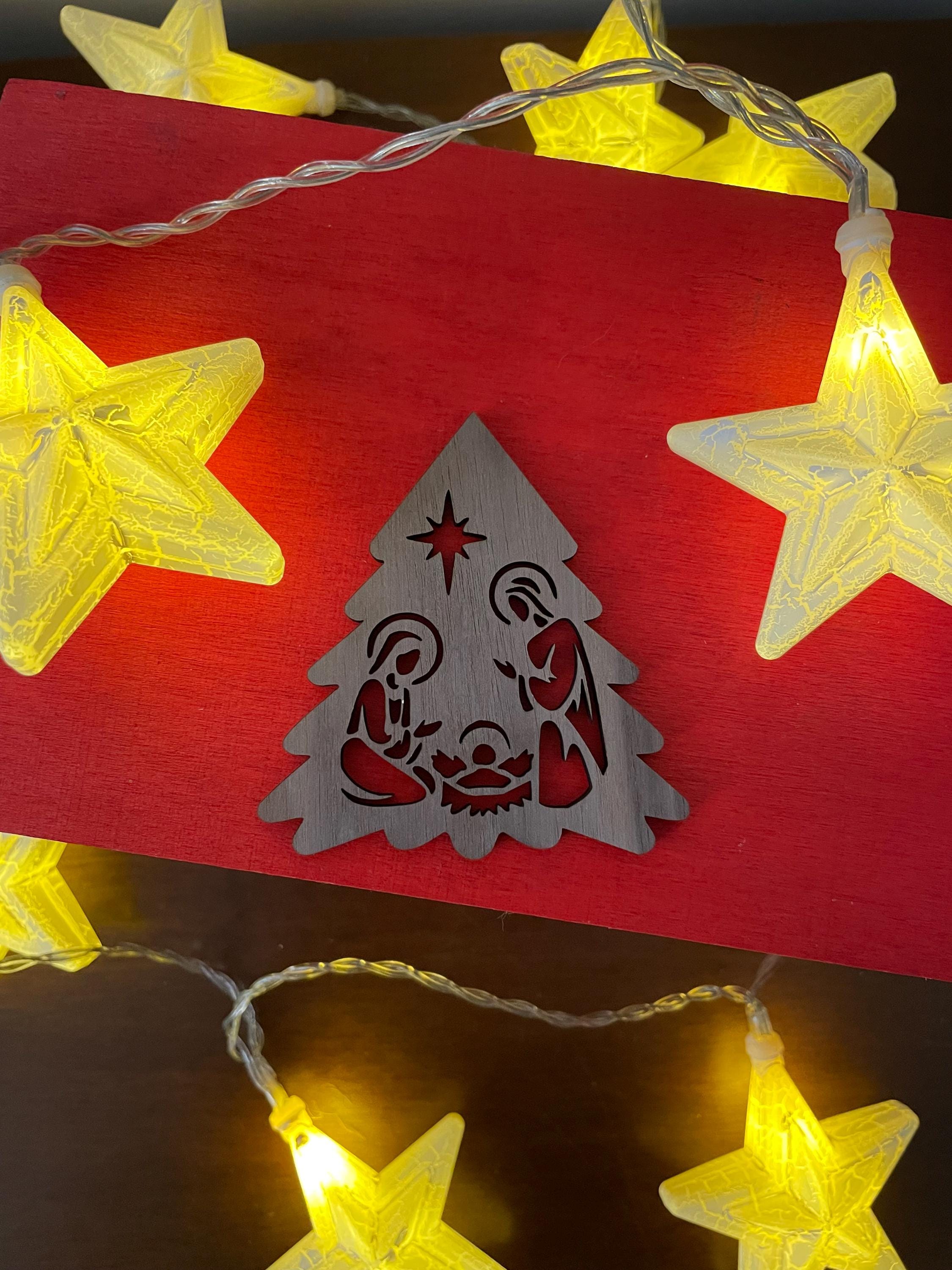 A simple Nativity scene, laser-cut from natural wood, tied with jute string and ready to hang.