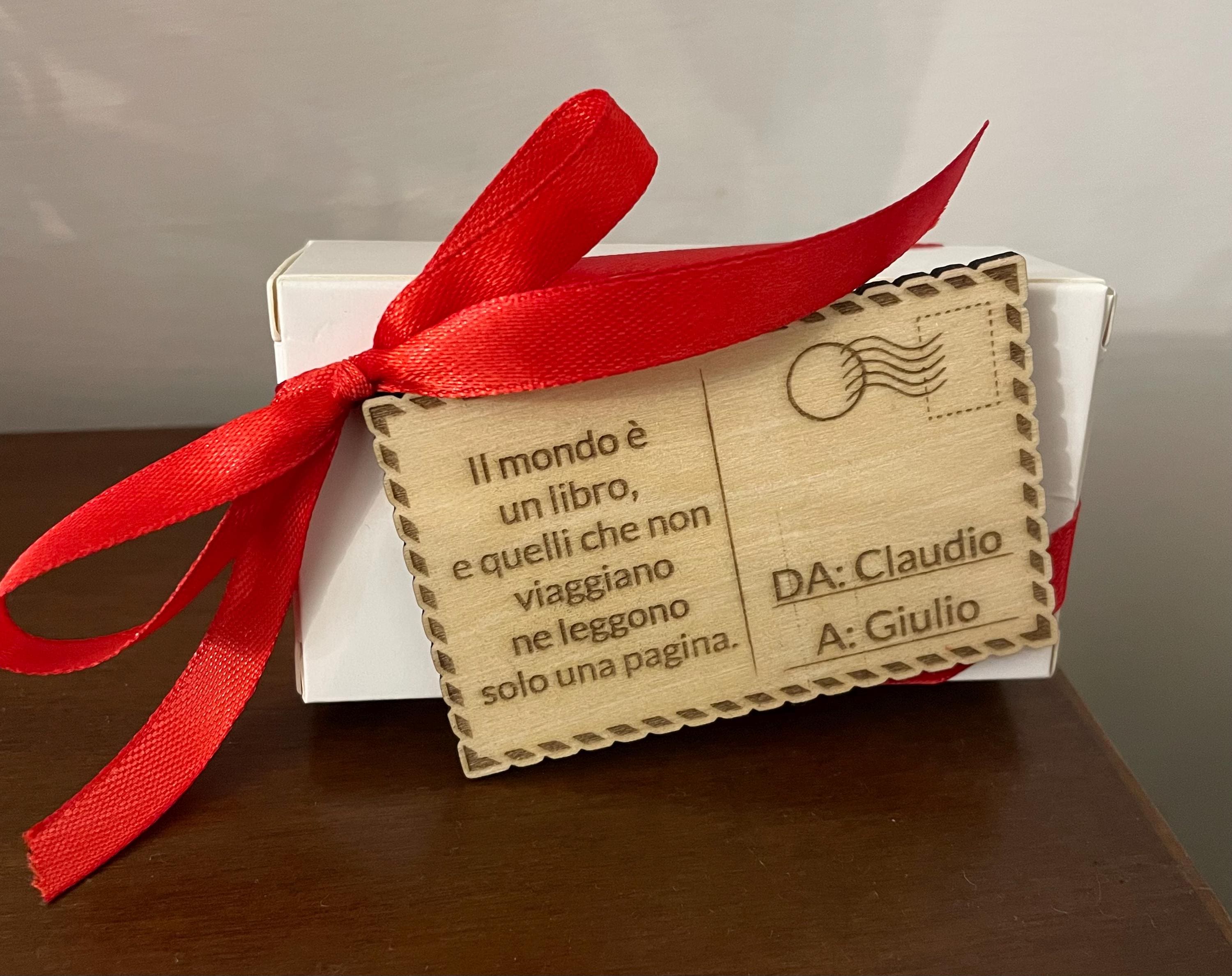 an elegant little box, tied with a red bow, with a personalized wooden tag and a corkscrew/key ring in the shape of an airplane.