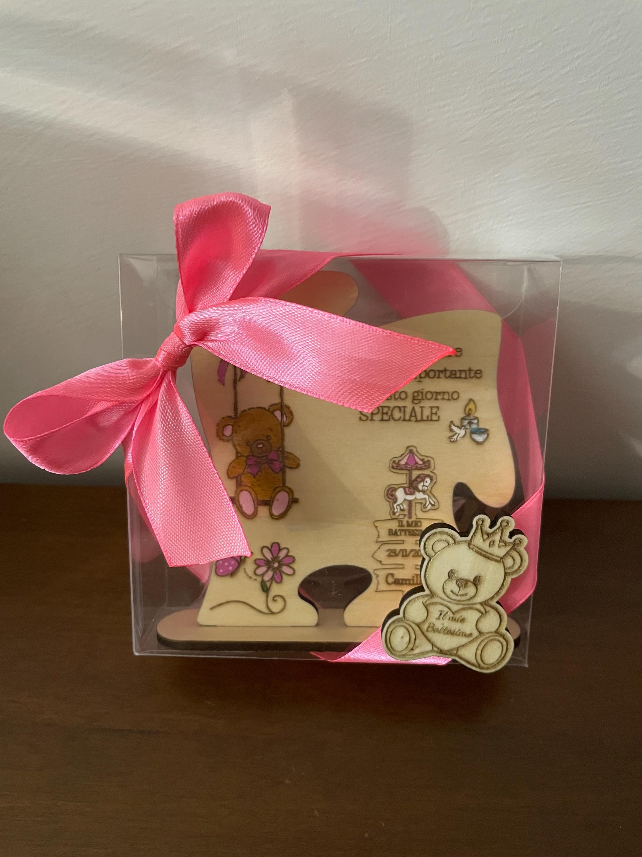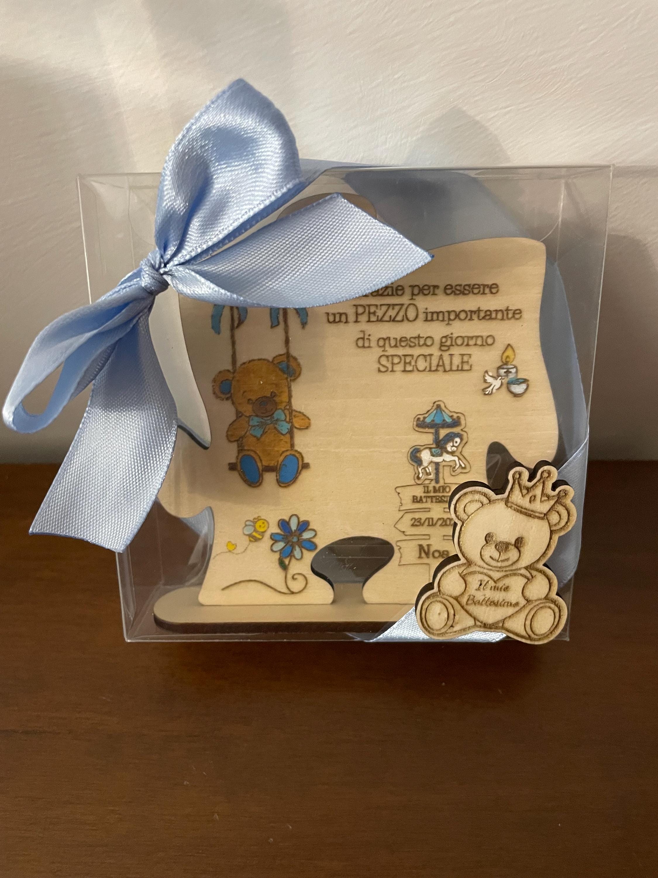 Your baby's baptism becomes a keepsake to display: a mini 10x9.5 cm wooden picture laser-engraved with a sweet teddy bear, a figure that accompanies babies in the first months of life, making them feel protected and safe, personalized with the name, date, and a short dedication.
