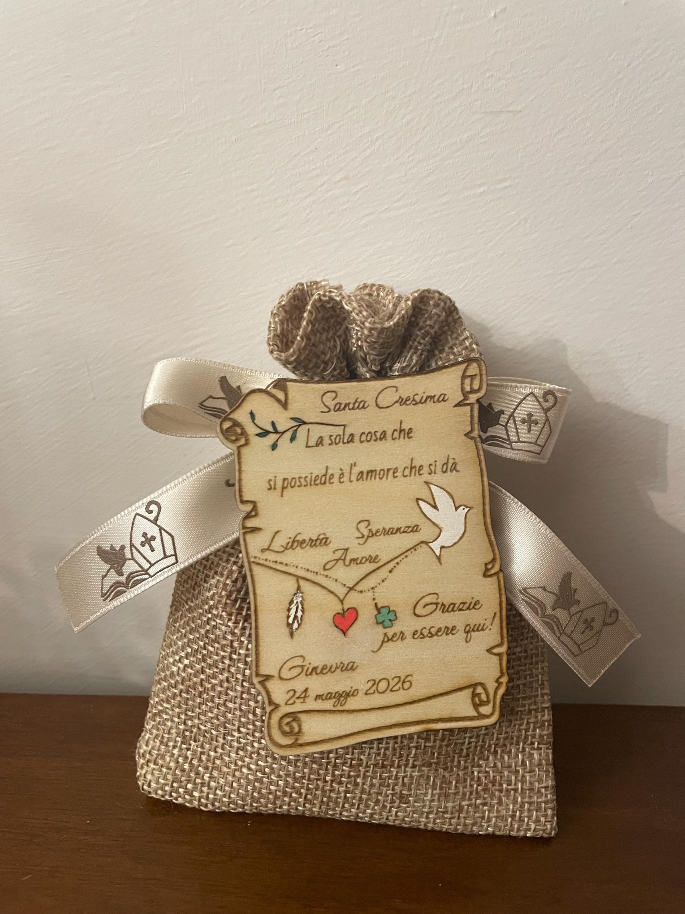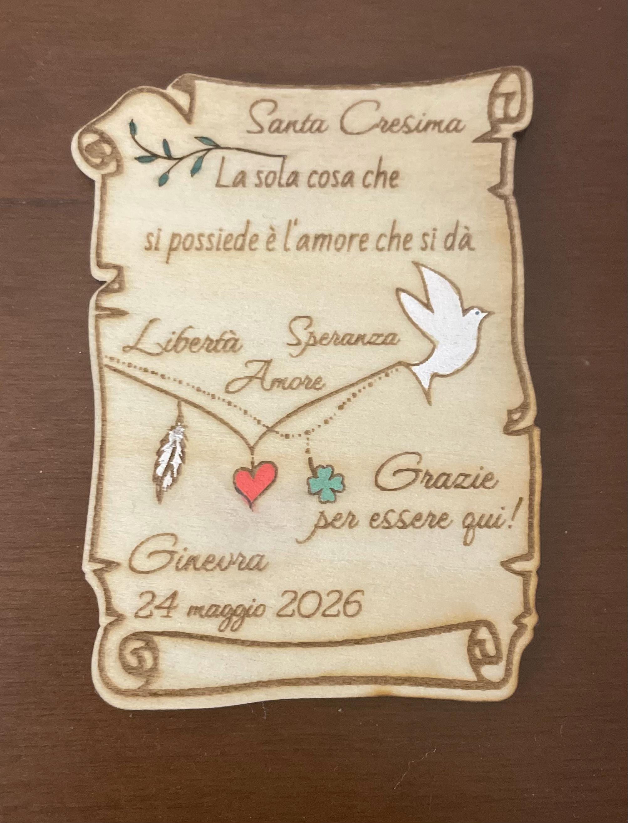 Our scroll-shaped wooden magnets are an original and meaningful way to celebrate your daughter's Confirmation. They can be personalized with the name and date of the event. These handcrafted favors, featuring the image of a dove carrying a feather, a heart, and a four-leaf clover, represent freedom, love, and hope—fundamental values to cultivate. Each magnet comes in a practical and elegant package, making your celebration even more special.
