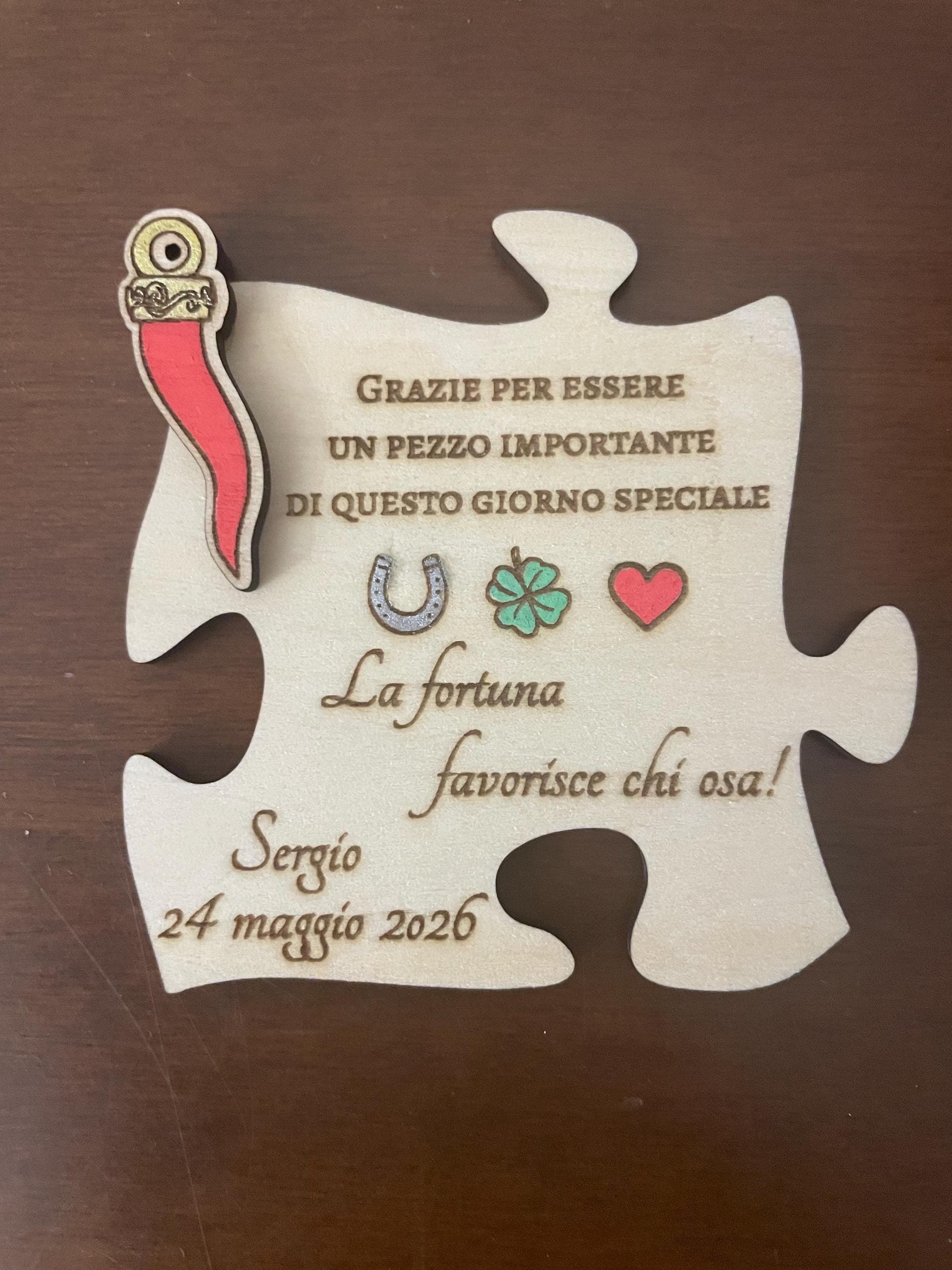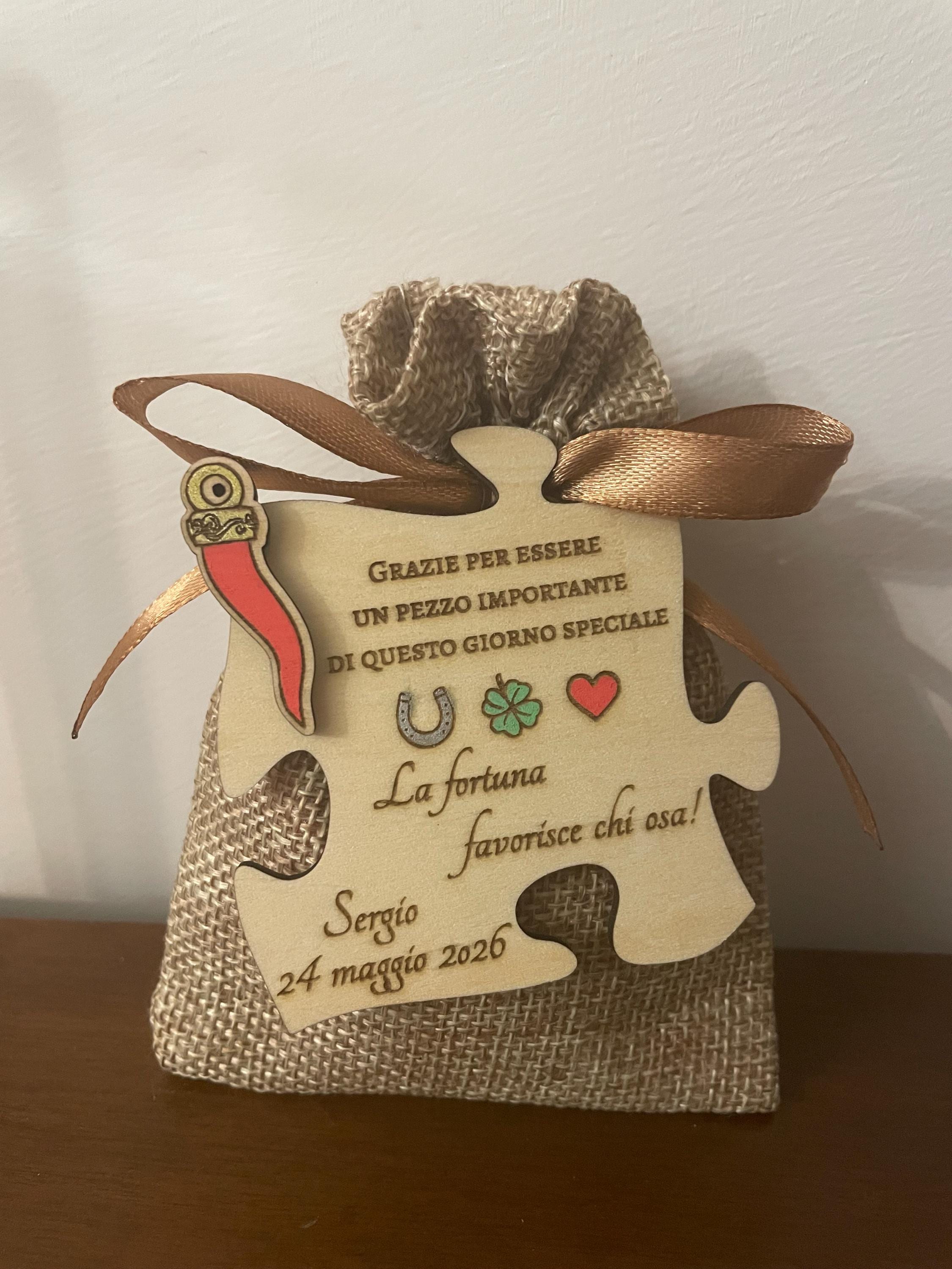 Our puzzle-shaped wooden magnets are an original and meaningful way to celebrate important occasions in your life, customizable with the name and date of the event. These handcrafted favors, featuring an embossed red horn—the quintessential lucky charm—are accompanied by the motto "Fortune favors those who dare," suggesting that fortune favors those who act with courage and determination in the face of challenges, motivating us to overcome fears and take risks to achieve results. Each magnet comes in a practical and elegant package, making your special day even more special.