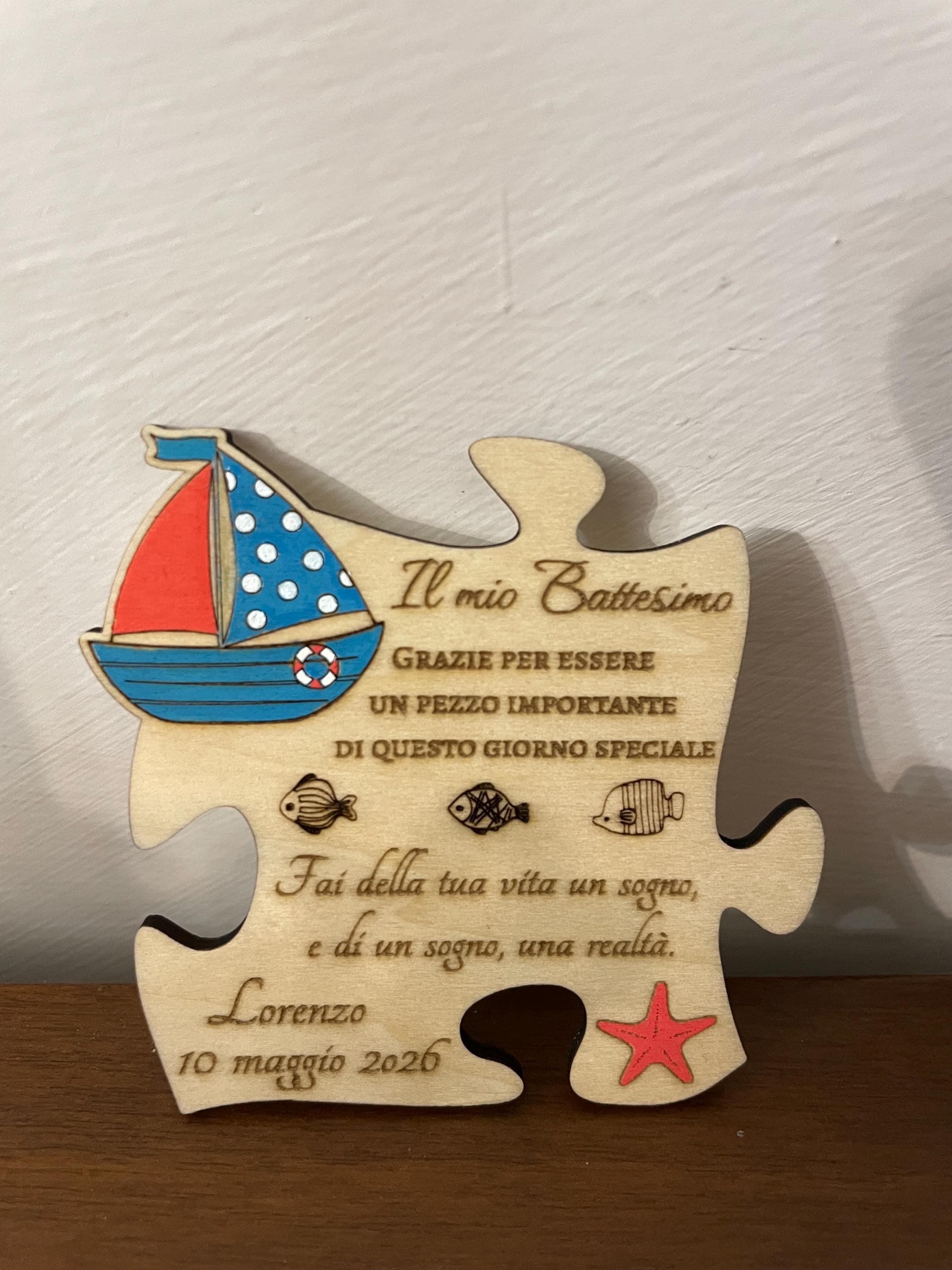 Celebrate your child's baptism with our laser-engraved and hand-painted wooden puzzle magnets. The charming little boat depicted symbolizes the journey, the journey of a newborn baby discovering the world, free and unconstrained, like a boat on the sea. Perfect for displaying on the fridge or any other magnetic surface, these handcrafted favors will remind your guests how important they are to your family.